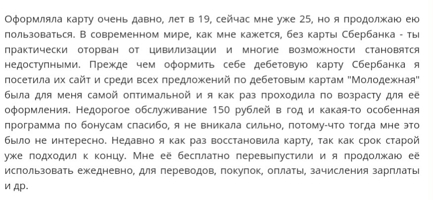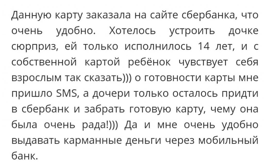Виктория, г.Волгоград: «Недавно мама предложила мне оформить банковскую карточку. Мы подумали и выбрали молодежную карту МИР от Сбербанка, т. к. увидели в интернете много положительных отзывов о ней. Мой возраст соответствует требованиям банка (мне 15 лет). Заявку я оформила самостоятельно на сайте Сбербанка. Это очень просто и не занимает много времени. В течение 5 дней курьер принес карточку. Использую ее для оплаты покупок, иногда снимаю наличные. Очень удобно».