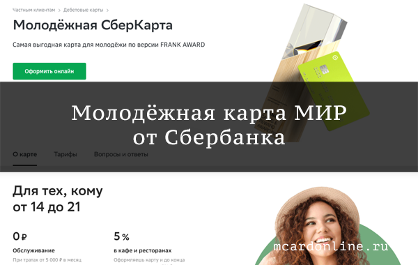 Молодежная карта МИР от Сбербанка — платежный инструмент для подростков от 14 до 21 года с низкой стоимостью обслуживания, выгодными условиями и полным набором функций обычной дебетовой карточки.